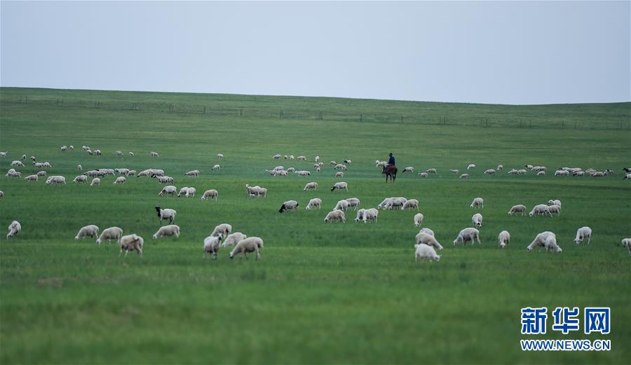 在内蒙古自治区呼伦贝尔市新巴尔虎右旗的草原上,羊群在草原上觅食。