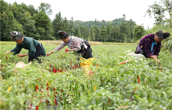 8月30日,贵州省丹寨县兴仁镇夭坝村,苗族妇女在采摘辣椒