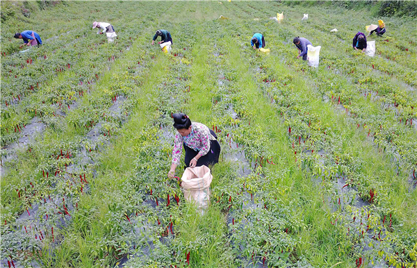 眼下,贵州省丹寨县的12400亩辣椒迎来了收获季,当地群众抢抓晴好天气,抢摘抢收。近年来,丹寨县把辣椒产业作为精准脱贫攻坚“四增到户”模式中的“产业增效到户”主导产业来抓,引导群众与公司签订种植协议,为百姓脱贫提供增收保障,并鼓励贫困村、贫困群众大力发展辣椒种植。
