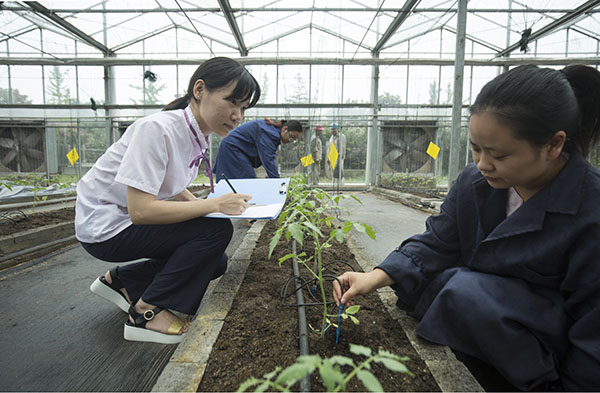8月27日,在江苏省海门市常乐镇一蔬菜基地,农技人员在观察记录番茄秧苗生长情况。