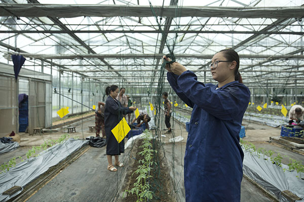 8月28日,在江苏省海门市常乐镇,农技人员在温室大棚内检查茄花授粉情况。