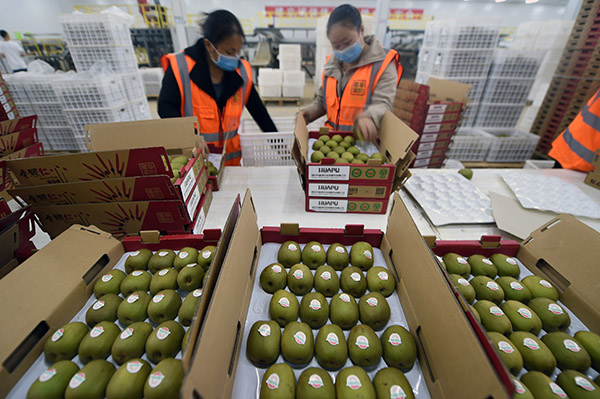 9月14日,在苍溪县红心猕猴桃加工基地的一家企业,工作人员将猕猴桃装入包装盒。