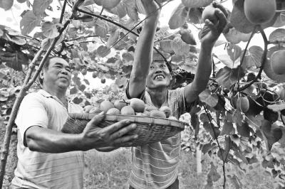 9月5日,在四川省泸州市纳溪区白节镇新桥村4组生态猕猴桃基地,种植户龙朝华(左)、胡登华忙着采摘猕猴桃装箱出售。