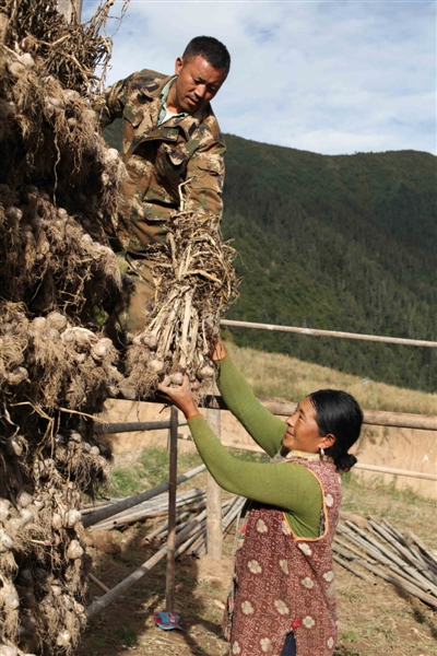 黑水县俄瓜村村支书齐王与村民阿合米搭档配合晾晒鲜蒜