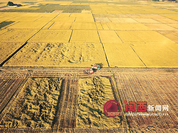 图为昨日记者航拍的河田国家粮食基地,现代化收割机正在收割晚稻。 党的十九大报告指出,要加快推进农业农村现代化。长汀县狠抓农业不放松,稳农强农夯基础,全县16.3万亩晚稻喜获丰收,目前正加紧全面收割。