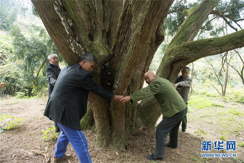 11月7日,几位榧农在诸暨市赵家镇合抱一棵千年香榧树。