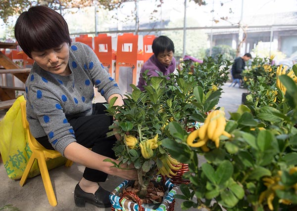 10月31日,在金华市金华山旅游经济区赤松镇北山口村锦林佛手文化园,员工们将佛手盆景修剪装箱,发给全国各地通过电商订购的客户。