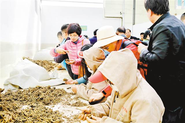 在制药厂车间,会议代表参观黄连的分拣和筛选。