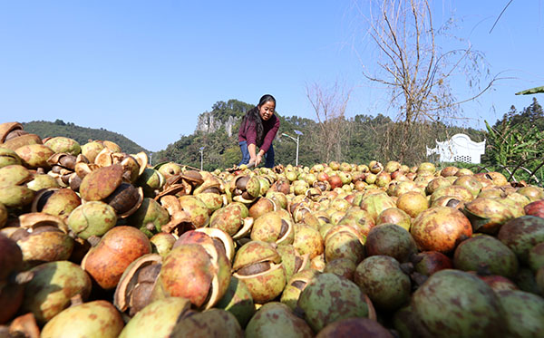 11月1日,村民在贵州省黎平县高屯街道八舟村晾晒油茶果。