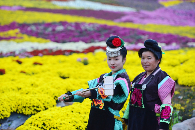 11月5日,当地村民在贵州省麻江县宣威镇药谷江村的菊花基地里留影。