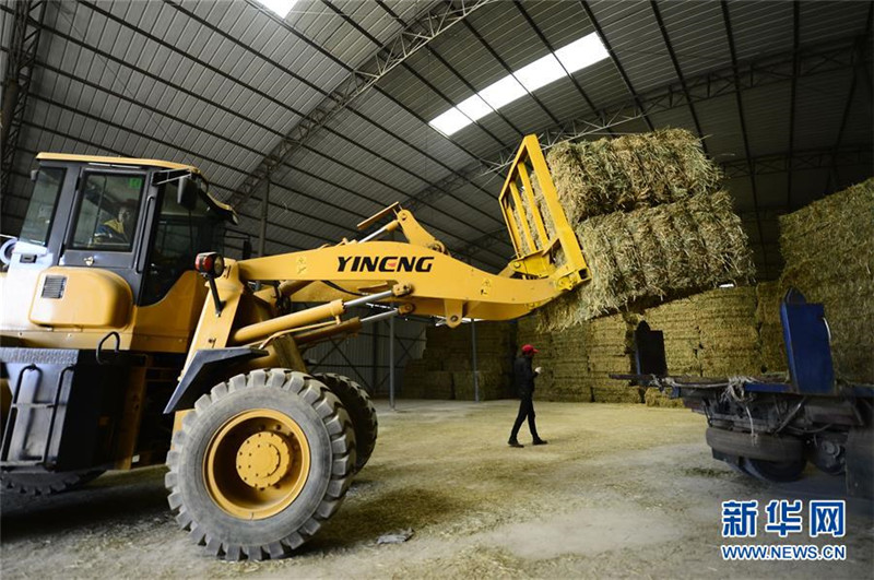 11月7日,青海省河卡种羊场,一台装载机正在转运牧草草捆。
