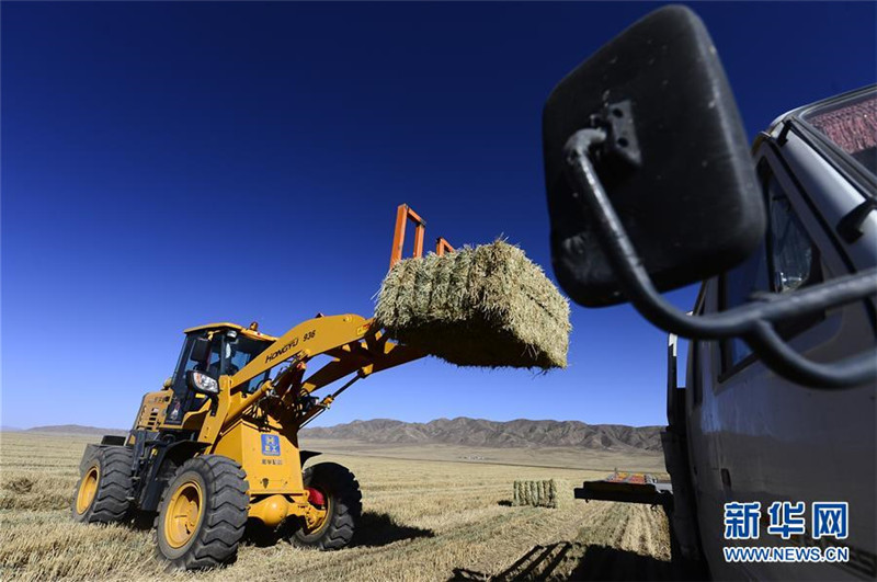 11月7日,青海省河卡种羊场,一台装载机将田间的牧草草捆运往转运车上。