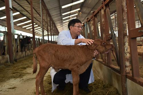 9月15日,在北京农学院位于平谷的试验基地,国家转基因重大专项课题“优质高效转基因肉牛新品种培育”负责人、北京农学院动物科学技术学院教授倪和民在照看第二代“转基因小牛”。2012年出生的首批含有脂肪性脂肪连接蛋白基因的体细胞转基因克隆牛“妞妞”成功繁育后代,第二代“转基因小牛”出生后各项体征正常。如今这头小牛已满半月,身体健康。新华社记者 李文 摄