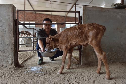 9月15日,在北京农学院位于平谷的试验基地,工作人员给第二代“转基因小牛”喂食。新华社记者 李文 摄