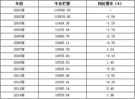 2001-2014年中国牛存栏量(万头)、