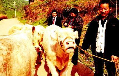 狮子口村位于山区,当地信用社支持农民发展养牛业。今年,信用社已为该村9户农民发放贷款30万元,计划购买66头菜牛,昨日已首批运回19头。(记者熊海泉 通讯员吴金好摄)