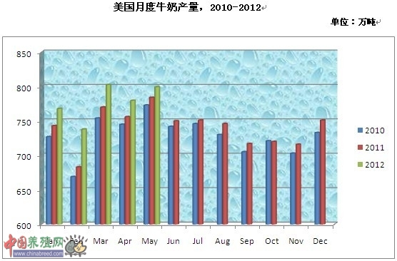 5月份,奶牛存栏927.2万头,比去年同期多6.4万头;平均每头牛产量862.3公斤(1901磅)。23个牛奶主产州奶牛存栏852万头,平均每头牛单产872.7公斤(1924磅)。