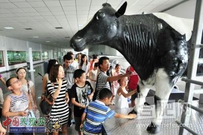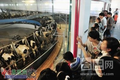 在讲解员的带领下,小作家代表们来到了现代牧业肥东牧场的生产车间,参观现代牧业牛奶生产全过程。透过参观通道的玻璃,俯瞰全自动挤奶车间,孩子们看到了一种有别于传统方式、完全自动化的挤奶场景。一头头奶牛正秩序井然地排着浩荡长队,挨个走上巨大的转盘式圆形转台,找准位置后,机械化挤奶吸盘便会自动扣住牛的奶头,一股股新鲜牛奶自动流出,其情其景与一般工厂的生产流水线基本一致。这样的场景引起了孩子们极大的兴趣,他们纷纷表示,这是自己第一次亲眼看到牛奶的生产过程,与想象中“在草原上人工挤奶”的情形完全不同,感觉很震撼。“回家之后第一件事就要写一篇作文,把今天的所见所闻记下来!”一位小朋友告诉记者。