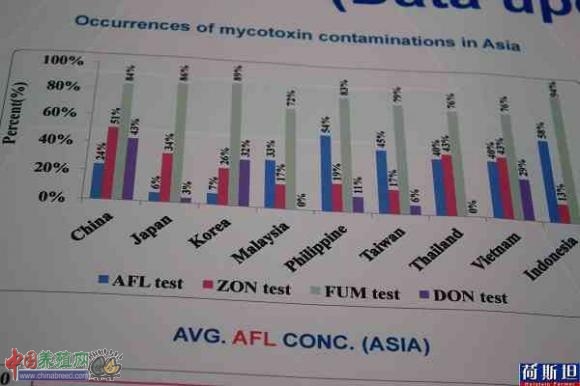 "相对比较低的是呕吐毒素。当然东南亚地区黄曲毒素很高,东北亚因为温度气温的关系,所以黄曲毒素可能真的不多。玉米赤霉烯酮,猪如果中这个毒的话,它会好像生孩子一样,所有分娩的状态都会出现。"