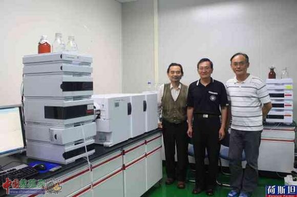 检测中心陈齐圣主任、陈家钟教授、钱伟钧助教在高效液相色谱仪前合影
