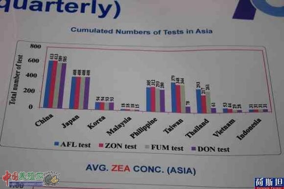农产品霉菌毒素是普遍关注的健康和安全问题,食品安全在台湾和大陆都是很发烧的话题,该实验中心助理教授钱伟钧给记者介绍了2012年亚洲地区最新霉菌毒素检测统计结果:"黄曲毒素的发生率事实上在四种毒素里,除非有一些特例的,大部分比较偏低,真正比较需要注意的是Fumonisin,伏马毒素就是烟曲霉毒素,发生率是最高的,事实上在有一些乳牛的饲料里,发现它感染的几率最高,奶牛中毒之后,好像是呼吸道有感染,所以外观看起来是感冒了,它会咳嗽,会打喷嚏。所以一般的饲养员以为就是感冒了,可是它事实上是中毒。整个亚洲地区,不管是东北还是东南亚,Fumonisin的情况其实都是值得注意的。"