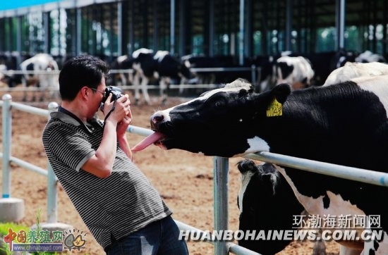 7月19日,在首农集团滦县新绿洲农业产业循环园区内,一名奶牛管理人员正在为新到的奶牛拍照“留念”,一头调皮的成年牛好奇地伸出头来,用舌头舔舐管理员。