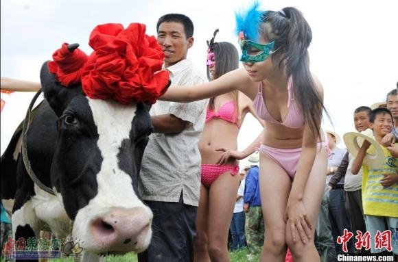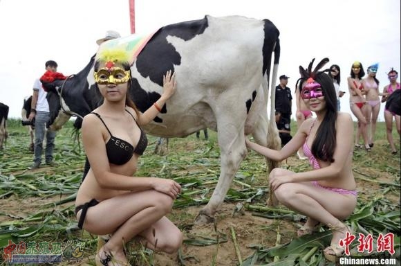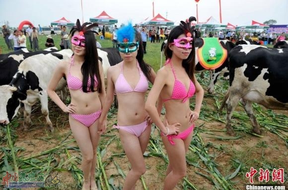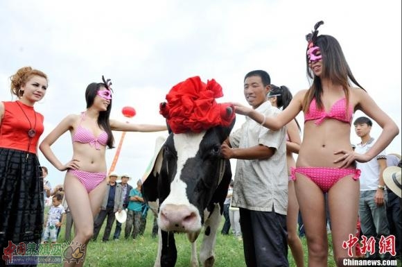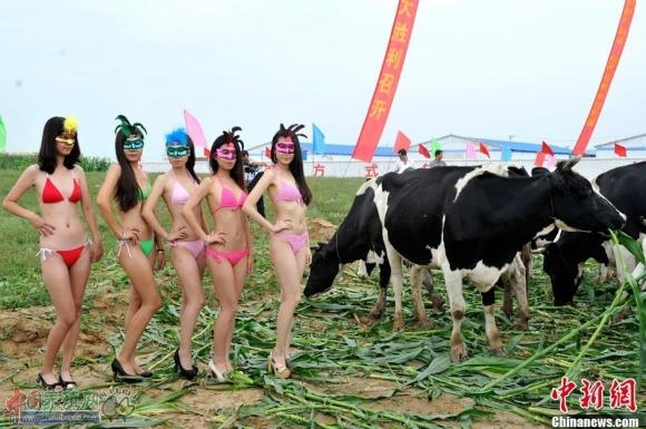 8月18日,山西朔州山阴县,比基尼模特为优质奶牛做"牛模特",与奶牛亲密接触。当日,山阴县联合美国奥兰治华威县举办首届"奶牛选美大赛",通过奶牛的产奶质量、外貌、家族血统选出首届"奶牛小姐"冠军。