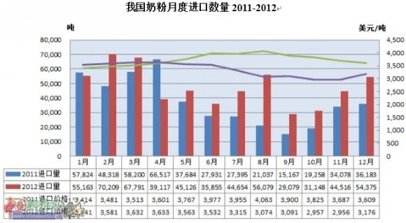 1-12月,进口57.29万吨,同比增加27.44%,进口额19.27亿美元,同比增加17.13%,其中从新西兰进口495,280.93吨、美国18,602.10吨、澳大利亚16,497.25吨、欧盟34,709.48吨。1-12月奶粉进口平均价格为3,364.41美元/吨,同比下降8.08%。