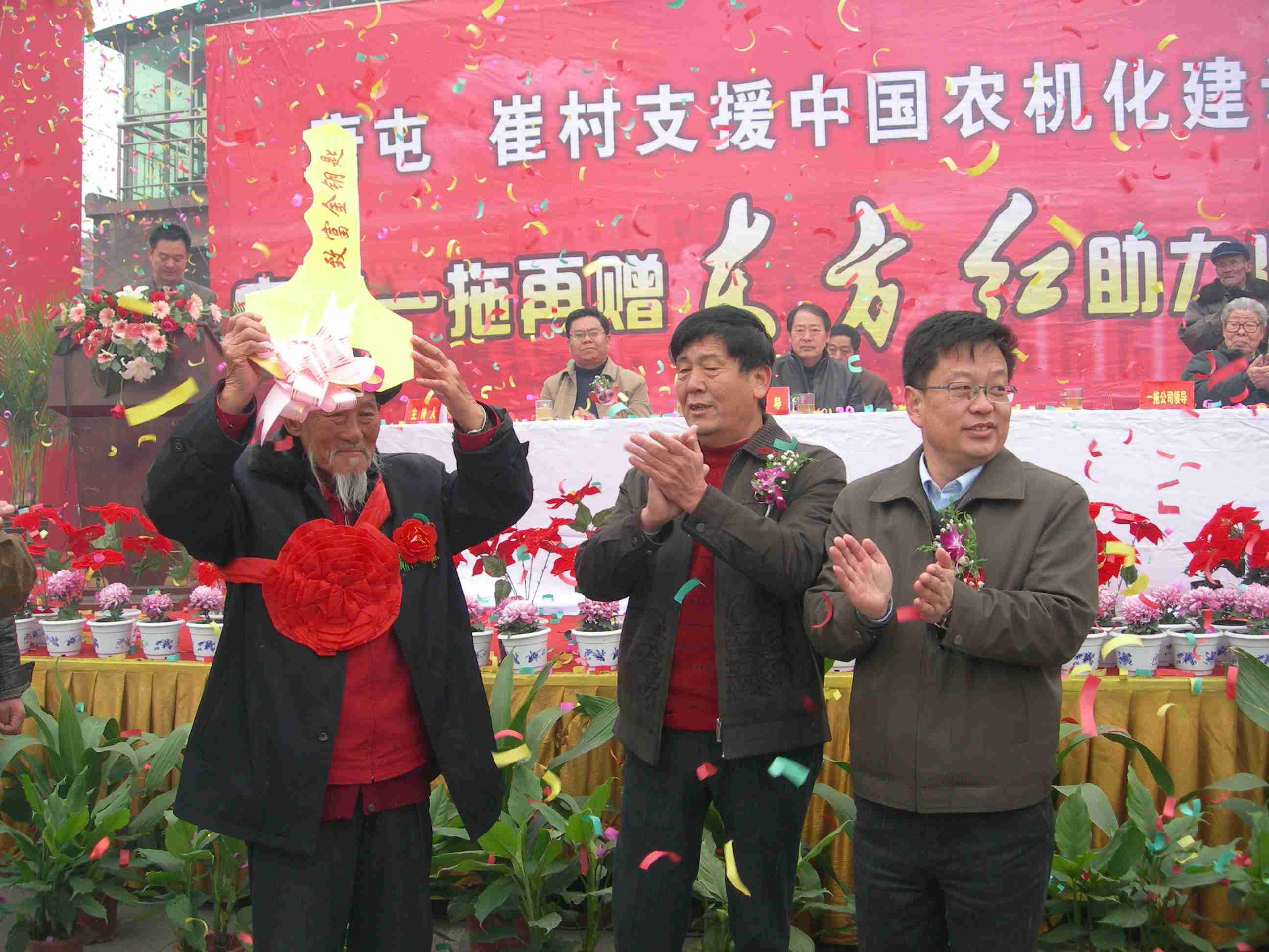 在礼炮声中,一台崭新的东方红-800大轮拖披红戴彩开进唐屯村。新中国第一位国产拖拉机驾驶员——今年已经92岁的唐屯村村民张炎生老先生再次接受了这台“东方红”拖拉机,并从一拖公司领导手中接过了象征致富的“金钥匙”。