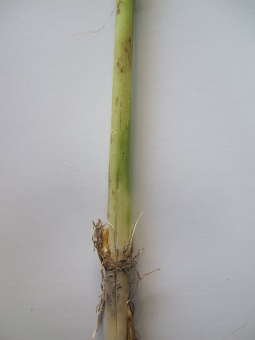 3.相同点:病稻株叶色深绿,上部叶片叶面可见凹凸不平的皱折;病株地上数节节部有倒生须根及高节位分枝。病株茎杆表面有乳白色大小约1-2mm的瘤状突出,呈蜡点状纵向排列成条,前期乳白色,后期褐黑色;病瘤产生节位因感病时期而异,越早患病,产生的节位越低。患病株根系不发达,须根少而短,韧性差,严重时呈黄褐色。