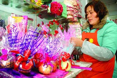 23日,在新华路上的一家鲜花店里,工作人员正在“赶制”平安果。