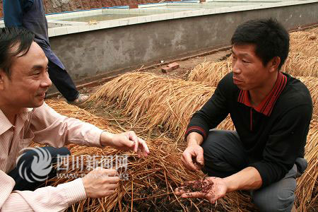 蒋运刚刚从泸州回来,他给泸州一家饲料公司送去了110斤蚯蚓。“每斤20元,这一趟收入2200元,净赚1500元。成都、重庆的客商纷纷打来订购电话,简直是供不应求啊。”蒋运刚高兴地说,他边带着记者参观养殖基地,边和记者侃侃而谈:“蚯蚓吃的‘粮食’是牛粪、猪粪,蚯蚓富含高蛋白质,用药具有退烧、清热、解毒的功能,还可以作为水产、农产饲料,作用非常广泛。1亩地1年能产5000斤蚯蚓。”