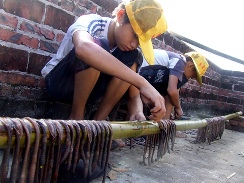 适逢暑假,放学在家的孩子们每天都早早起来,结伴去诱引蚯蚓。在阴暗潮湿的荒地和低洼地带,随处都是蚯蚓的藏身之地,一桶“茶麸” 水洒下去,不到十分钟蚯蚓就慢慢地钻了出来。短短一会儿的功夫,孩子们收获可不少。“地龙”的加工包括水冲、剖腹、晾干等工序,5公斤的蚯蚓两个人不到半个小时就加工完成。阳光充足的日子,一般一天时间就可以晒干,目前“地龙”的收购价格在每公斤20元左右。黄竹塘村民加工“地龙”已有近十年的历史,许多群众通过这门技术走上了富裕的道路。