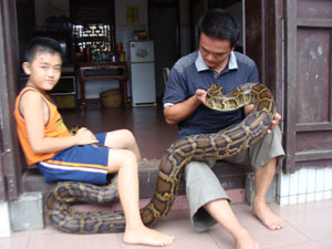 黄开宁没想到,这条蟒蛇竟成为他的“红娘”,促成了他的婚姻。1998年,邻村的姑娘晓兰听说黄开宁养了一条蟒蛇,就和朋友一起到他家观赏。晓兰当时想:“一个男人对小动物都这样有感情,细心照顾,心地一定很善良。”她对黄开宁心生好感,双方渐渐建立了深厚的感情。一年后,两人结为夫妻。