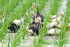 针对目前稻田不中耕、不除草、不施化肥农药,超级杂交水稻各生育期特点,水稻病虫害发生规律,袁隆平超级杂交水稻基地从日本引生态农业示范推广项目“稻鸭共生”项目。