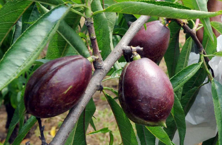 2009年5月24日,镇江市象山果树研究所果农在为国内珍稀黑油桃套袋。据了解,这种黑油桃是象山果树研究所从野生油桃中筛选出经过6、7年的进化、培育、观察黑油桃1系、2系性状稳定。这一新品种已引起省农科院园艺研究所的重视,目前正对黑油桃果树种质资源进行保护利用,对其生长过程作跟踪测试。
