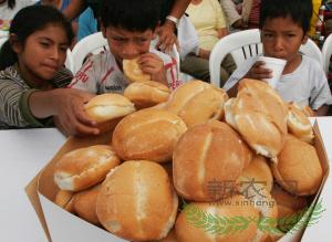 秘鲁政府鼓励面包师用土豆粉制作面包。政府正将土豆面包配发给中小学生、军人等。图为秘鲁儿童食用土豆面包。