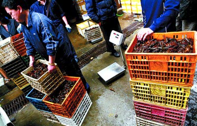 女工回答说:“这样浸一会儿就很干净了,肚子里的垃圾很快就会排出来的。 ”见记者不信,她拿出水斗旁的一个盒子,打开后,里面都是白色粉末。