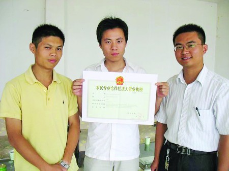 孙磊(左)、刘振东(中)、孙和臣(右)领到营业执照。