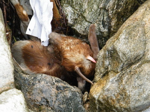 近日,笔者带常州朋友到金寨县天堂寨镇政府对面河东小河里游玩,无意间发现了一只死了的野山羊,只见它四肢蜷成一团,卡在一个大石缝里,笔者试着用卫生纸包住它的一只角,想把它拔出来,不想却把角的一层外壳全部拔掉了。它的腹部已生满了蛆虫,看来它已“光荣”了好多天了。因为在它遇难地上面有一口很深的龙井,龙井上面是一道瀑布。根据现场情况分析,这很可能是上周的连续大暴雨,造成山洪暴发,山羊欲跃过河面,不小心被大水冲进峡谷,被激流漩涡卷进这个石头峡缝里不能自拔而不幸遇难的。