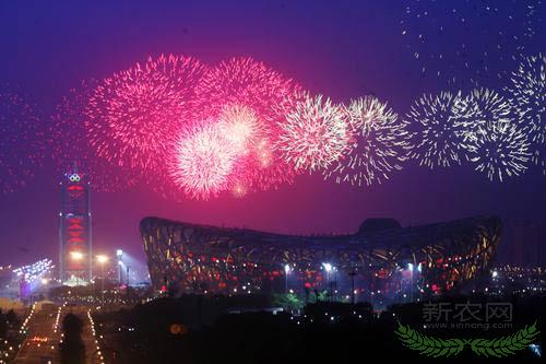 本报讯 昨晚,夜幕降临,“鸟巢”内灯火辉煌,鼓瑟齐鸣。20时02分,“砰”的一声巨响后,万朵烟花围绕着“鸟巢”开始盛放,组成四组绚丽的图案。