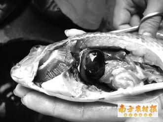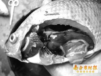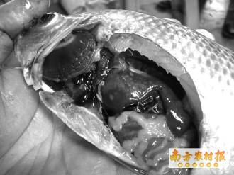 8月25日下午,记者看到同在莲塘的养户老梁正在打捞死鱼,捞出来的尸体堆在岸边,全部双眼凸出,拿起几条尚能活动的病鱼解剖发现,胆囊明显肿大,估计是由链球菌病引发的肝胆综合征。