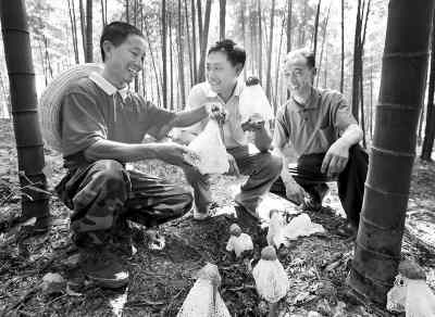 图为8月22日,陈永华博士(中)和农民一起查看竹林里长出的竹荪。