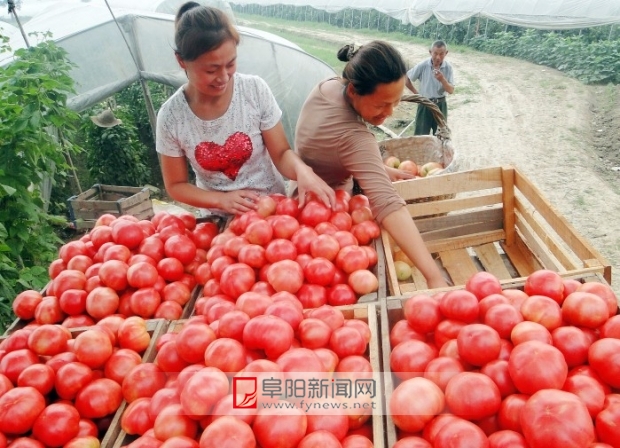 近年来,颍上县慎城镇张阳社区居民面对人多地少的现状,积极转变观念,发展大棚蔬菜种植,走上了致富道路。目前,该社区1180户居民中,有960户从事大棚蔬菜种植,种植面积从3亩到10亩不等,每亩年纯收入可达2万元。图为军属陈平种植的西红柿近日喜获丰收,她与妹妹正忙着采摘果实。