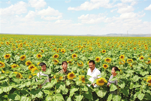 图为王军(左二)在示范田里查看向日葵生长情况。