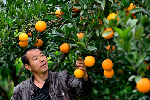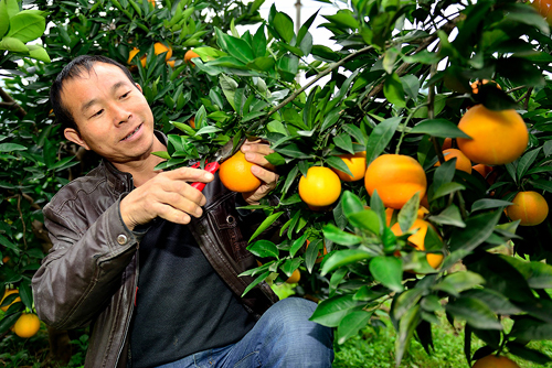 黄俊久在自家果园内摘脐橙