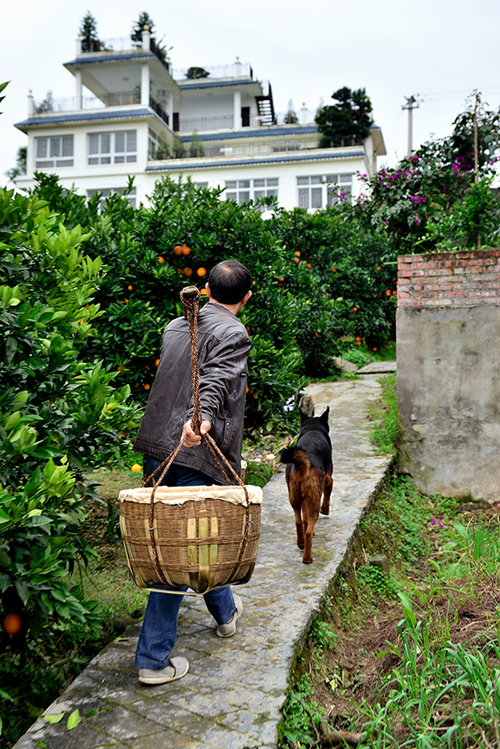 黄俊久挑着脐橙框往回走,前方便是他家的三层小洋楼