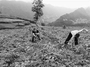 在外打工12年,巫山当阳村民胡华(中穿黑衣者)选择回乡创业,成立金刚家庭农场,种植黑土豆。他将田间实时劳作图片分享到QQ空间、微信朋友圈、微博,带火了销售。