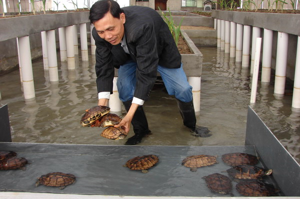 昨日是长假最后一天,广东省佛山市顺德区均安镇养殖户欧阳国东仍在他的养殖场忙个不停。这个长假对他这样的养殖户来说意义特别,因为他们前几天应邀出席了中山古镇举办的全国名龟博览会,以龟会友,交流经验,了解了许多赚钱的门路。