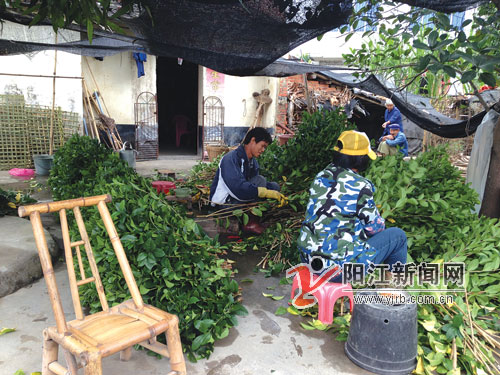 12月初,南下的冷空气夹带着丝丝寒意,晚稻的收获场面已近尾声,在阳春市潭水镇旗鼓村鱼田自然村,另一番火热的收获场面仍在继续。当地村民谢何生和家人坐在一大堆绿油油的枝叶里,正在捆扎栀子叶。在谢何生眼里,这些“6支一扎卖1块多,一亩能产8000扎,一年四季可收获”的绿叶子,20多年前就已取代甚至超过了黄澄澄的稻谷带给村民的喜悦。